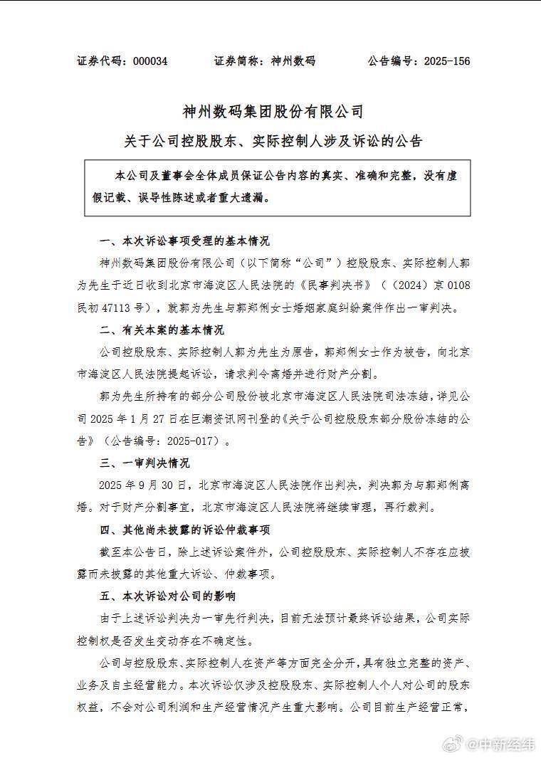 近年来上市公司大股东“天价”离婚频发。10月10日,神州数码公告,控股股东、实际控制人郭为涉及的婚姻家庭纠纷案件于2025年9月30日作出一审判决,判决其与郭郑俐离婚。而对于财产分割事宜,法院将继续审理,再行裁判。今年1月27日公司曾披露,郭为所持有的7738.89万股公司股份此前被北京市海淀区人民法院司法冻结,若冻结股份后续被处置,存在公司控股股东发生变更的风险。若以10月10日神州数码收盘价43.86元/股计算,前述冻结股份对应市值约为33.94亿元。神州数码表示,公司与控股股东、实际控制人在资产等方面完全分开,具有独立完整的资产、业务及自主经营能力。本次诉讼不会对公司利润和生产经营情况产生重大影响。