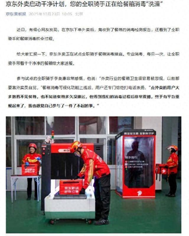 10月23日,京东黑板报发文称:近日,有细心网友发现,在京东下单外卖后,竟收到了餐箱的消毒检测报告,还看到了全职骑手和餐箱消毒的全过程。