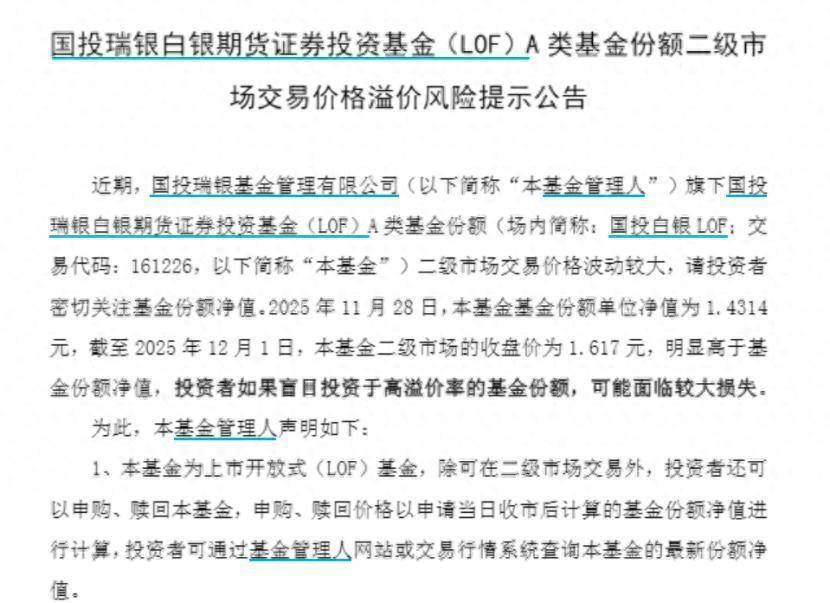 12月1日盘后,国投瑞银白银期货LOF公告提示二级市场交易价格溢价风险。公告显示,近期国投瑞银白银期货LOF的A类份额在二级市场交易价格波动较大,请投资者密切关注基金份额净值。